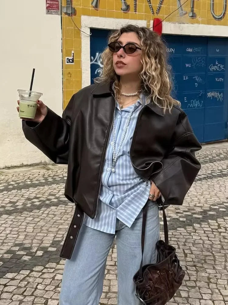 Casual Lapel Zipper Waist Belt Short Leather Jacket 2026 Women Loose Solid Pocket Pu Coat Autumn Lady Daily Highstreet Jackets