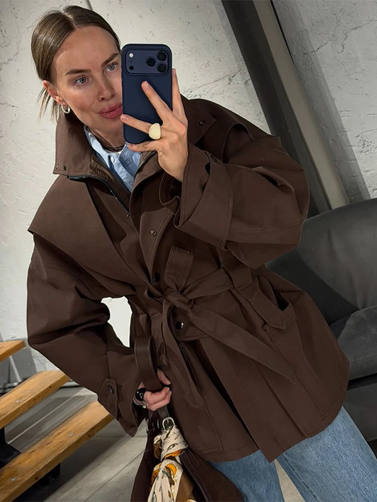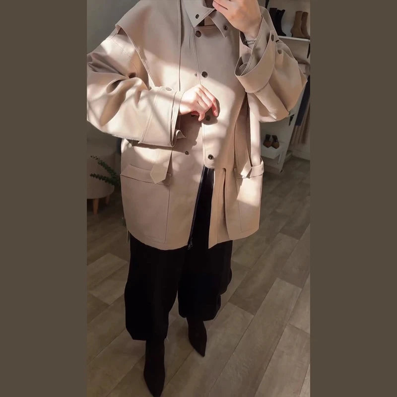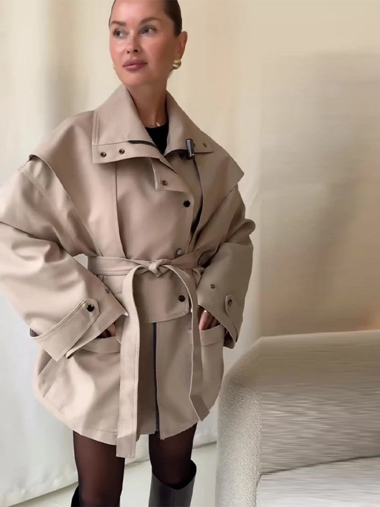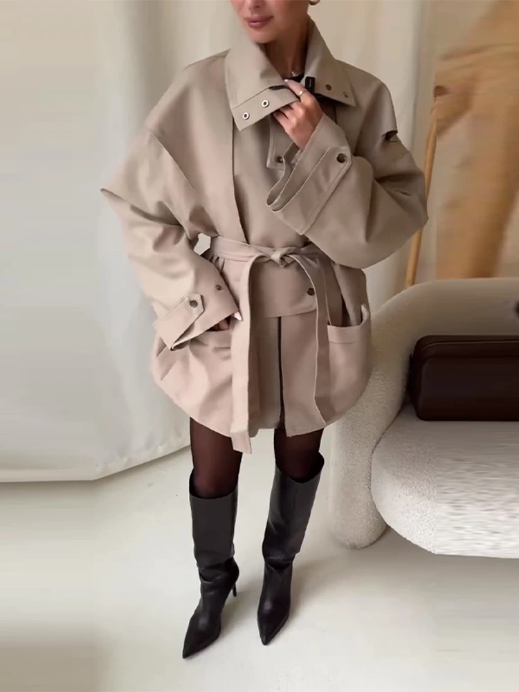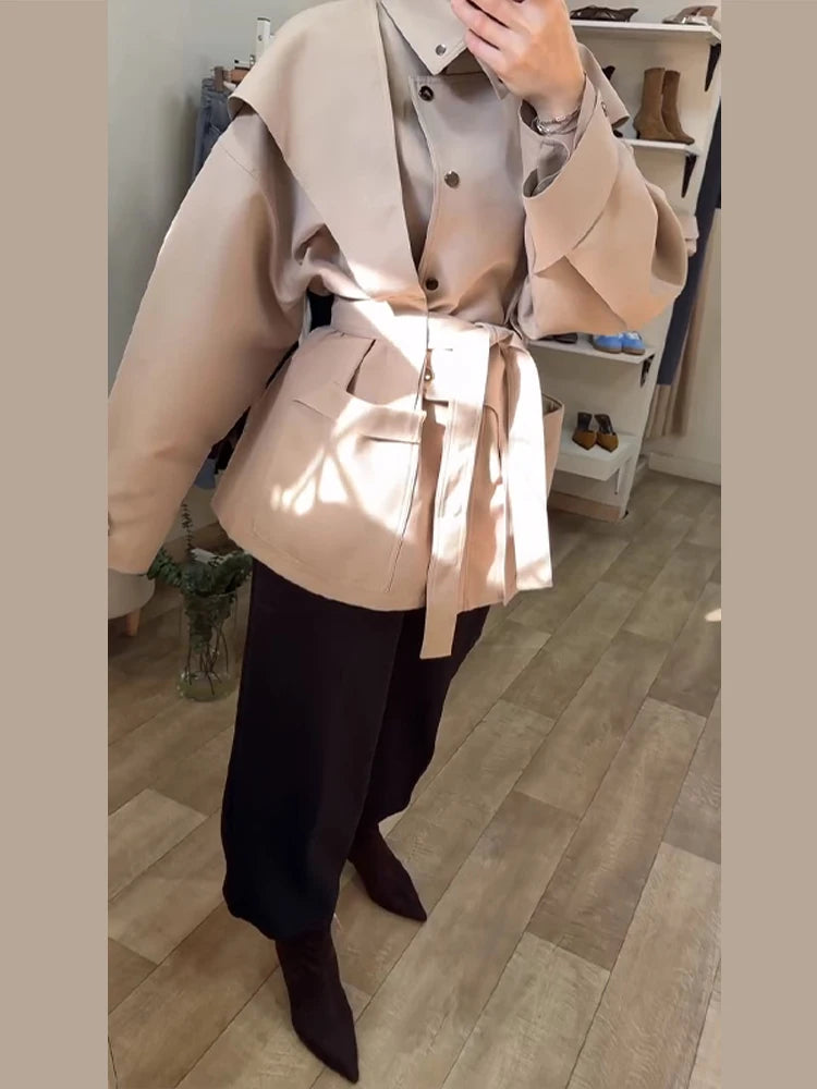 Oversized Tie-Waist Cropped Trench Coat Drop Shoulder 2026 Spring Women Modern Edgy Outerwear Fashion Chic Lady Streetwear Coat